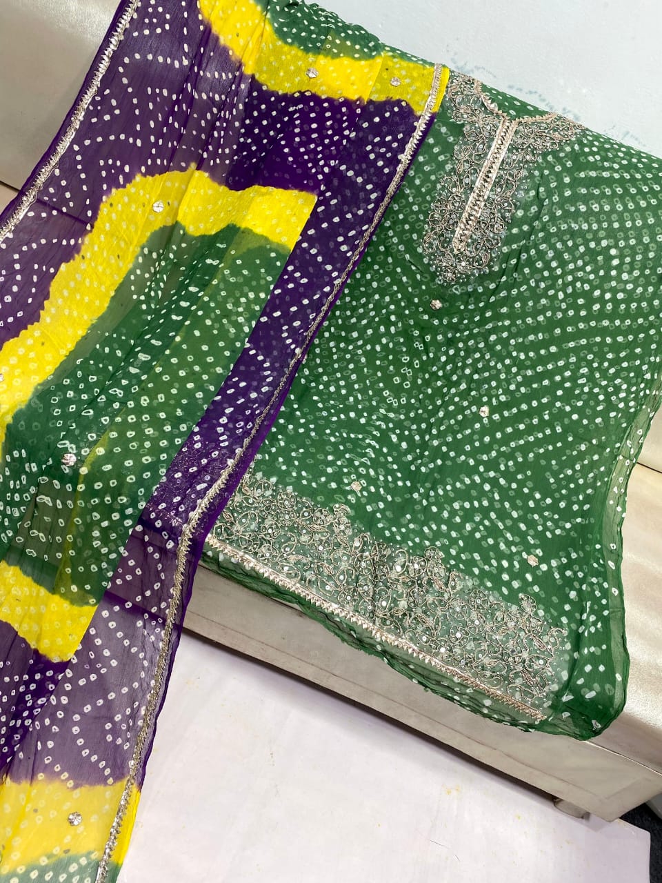 This 2-piece handmade Chunri suit is beautifully adorned with Kundan and Gota work, creating a truly festive and regal look.